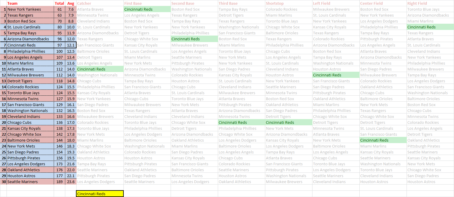 It’s interesting seeing how all the teams stack up.  I don’t think there are a whole lot of surprises here, but I’ll let you decide for yourself.  You should browse the entire series, as there is tons of info that you know is going to be as reliable as anything else out there.  I’ll also include my graphic that includes all rankings at all positions, with the Reds spots highlighted, of course.