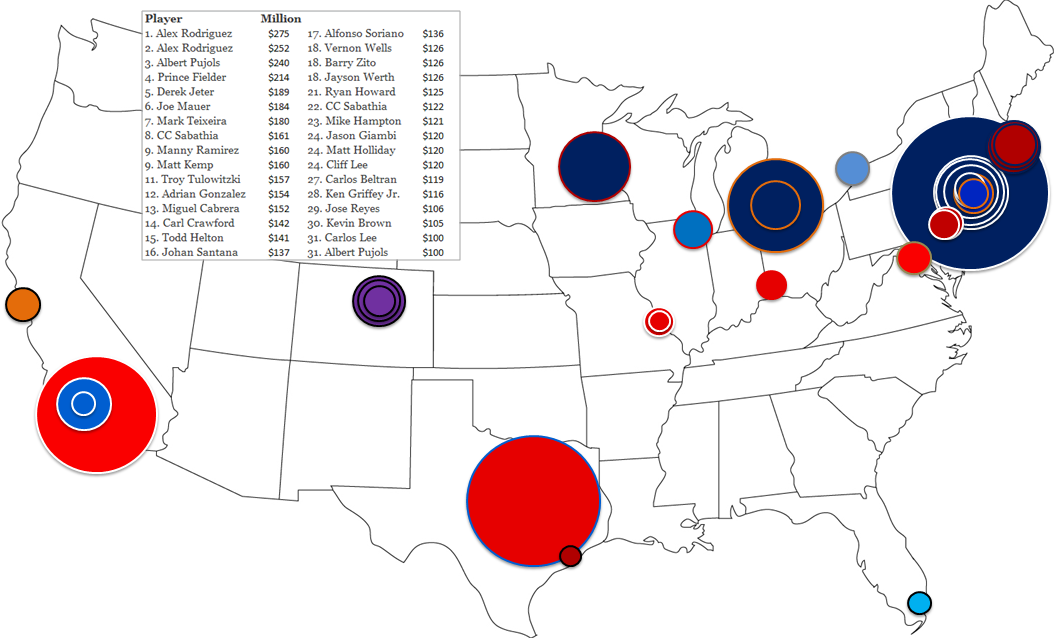 With that out of the way, let’s say we want to determine how many dollars Prince Fielder’s league-leading 117 runs are worth. As I mentioned before, you might first decide that the place to start is determine how much a single run is worth. However, we can’t simply look at a single run out of context. If Prince Fielder were to score 1 run the entire year, he would actually provide negative value. Instead, we need to compare his aggregated total to that of the average player. To do this, I introduced our second assumption, which is that the average number of at bats for a typical major league starter is around 550. I honestly don’t have a lot backing that up. I mostly based it off of the idea that 600 AB is a full season, and then I wanted to account for routine off days, minor injuries within our pool of players, etc. (I might also argue that what this exercise is really doing is calculating relativities, so the exact number I picked here doesn’t really matter much.)